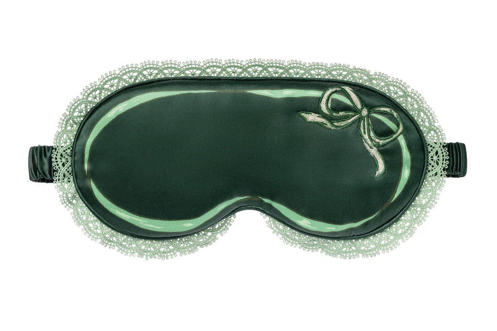 CONTOUR SLEEP MASK AND SCRUNCHIE SET. Includes: 1 x evergreen pure silk contour sleep mask with lace trim and embroidery (3.8" x 8.4" / 9.5cm x 21.2cm), 1 x black pure silk skinny scrunchie, 1 x white pure silk large scrunchie.