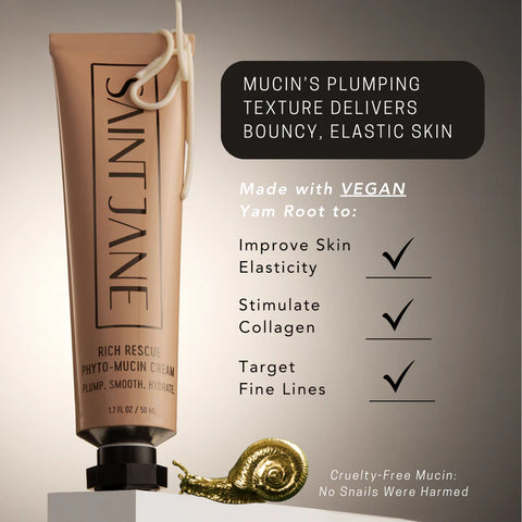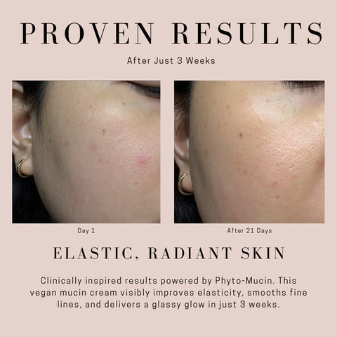 Vegan Mucin Cream for Elasticity, Plumping and Deep Hydration. This first of its kind, vegan snail mucin cream delivers elasticity, plumping and anti-aging benefits. Korean formulated from Yam Root combined with Niacinamide, Hyaluronic Acid and Sacred Lotus to target fine lines, stimulate collagen and improve skin elasticity. It has a gorgeous, stretchy texture leaving skin plump and bouncy to the touch.